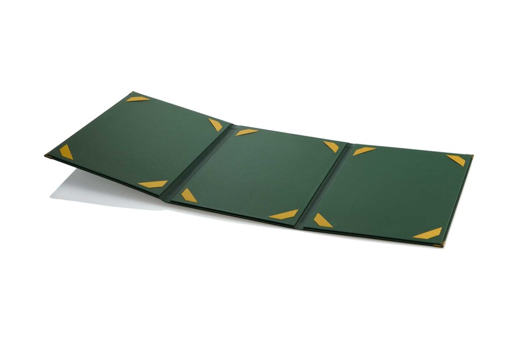 Falls Sie sich an Ihre alten Fotoalben erinnern können, sollten Ihnen unsere Schleifen bekannt vorkommen. Dezent in den Ecken platziert, ermöglichen diese kleinen Ausschnitte, Ihre Menüblätter wie bei einem Fotoalbum zu befestigen. Papierseiten werden hierbei unter die im DIN-Format platzierten Schleifen gelegt und werden sicher festgehalten. Die Schleifen leiern nicht aus und sorgen daher für einen dauerhaften Einsatz Ihrer Speisekarten. Charakteristisch für unsere Modelle mit Schleifen ist die reduzierte Seitenzahl, da auf jeder Seite nur ein Blatt präsentiert wird. Aus diesem Grund eignen sich die Modelle Finessino, Trio, Delicard und Signmaster Premium vor allem für Gastronomiebetriebe mit kleinen Menüs oder Tagesangeboten.